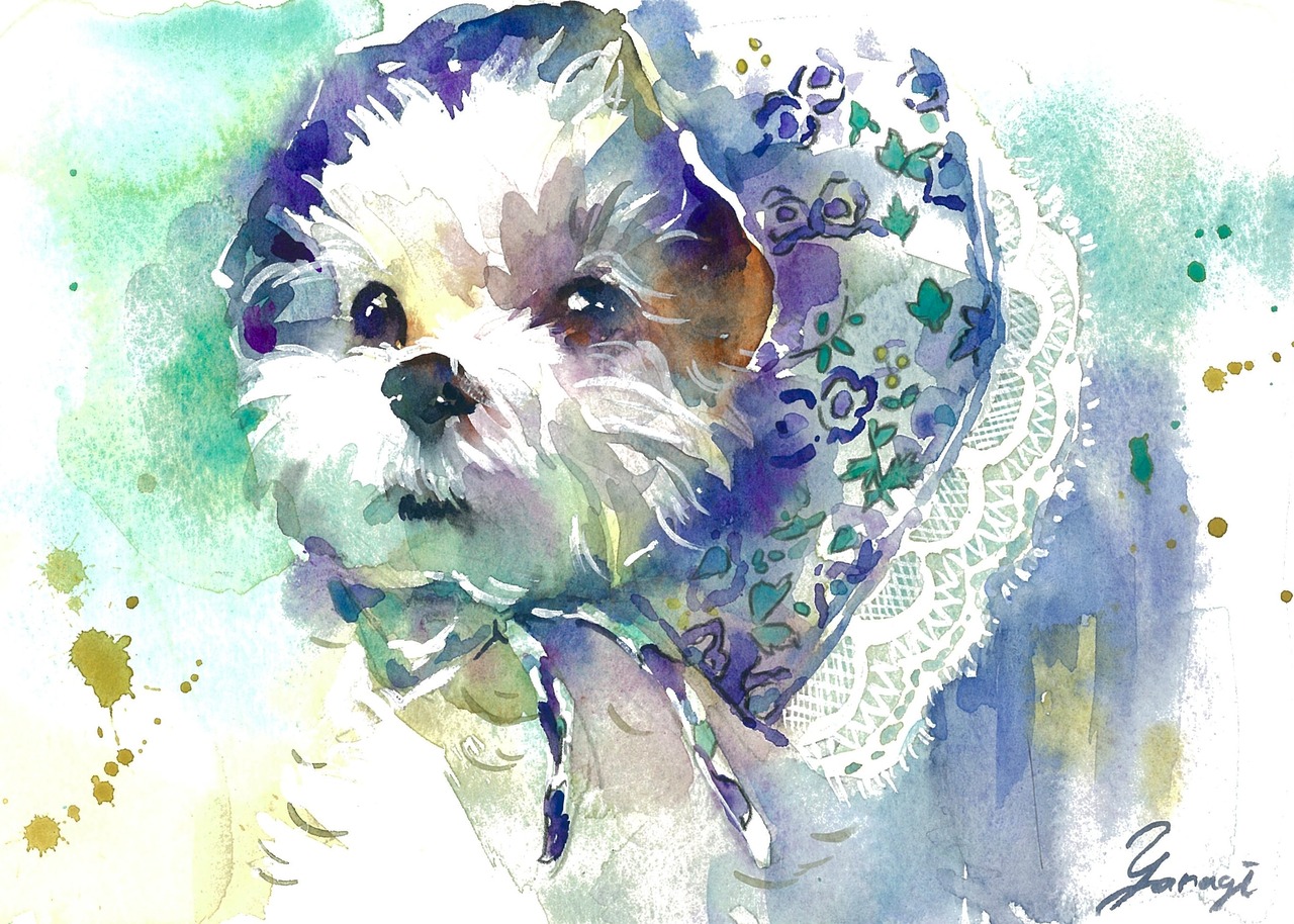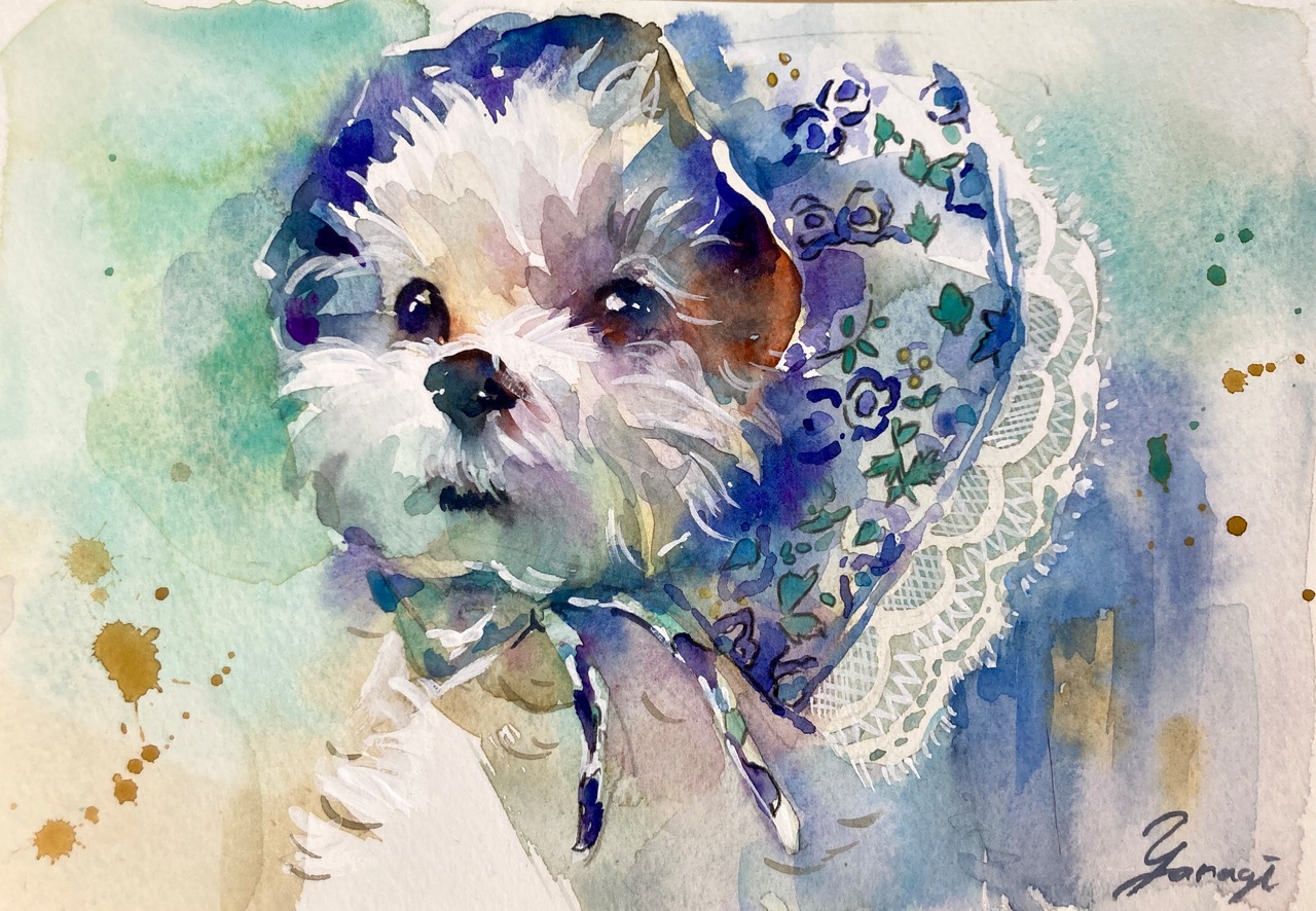 #犬#小型犬#シーズー#マルチーズ#花柄#レース#透明水彩 #水彩 #水彩画 #イラスト #アート #art #アナログ #インテリア #飾り #鑑賞 #美術 #芸術 #作品 #ギャラリー #watercolor