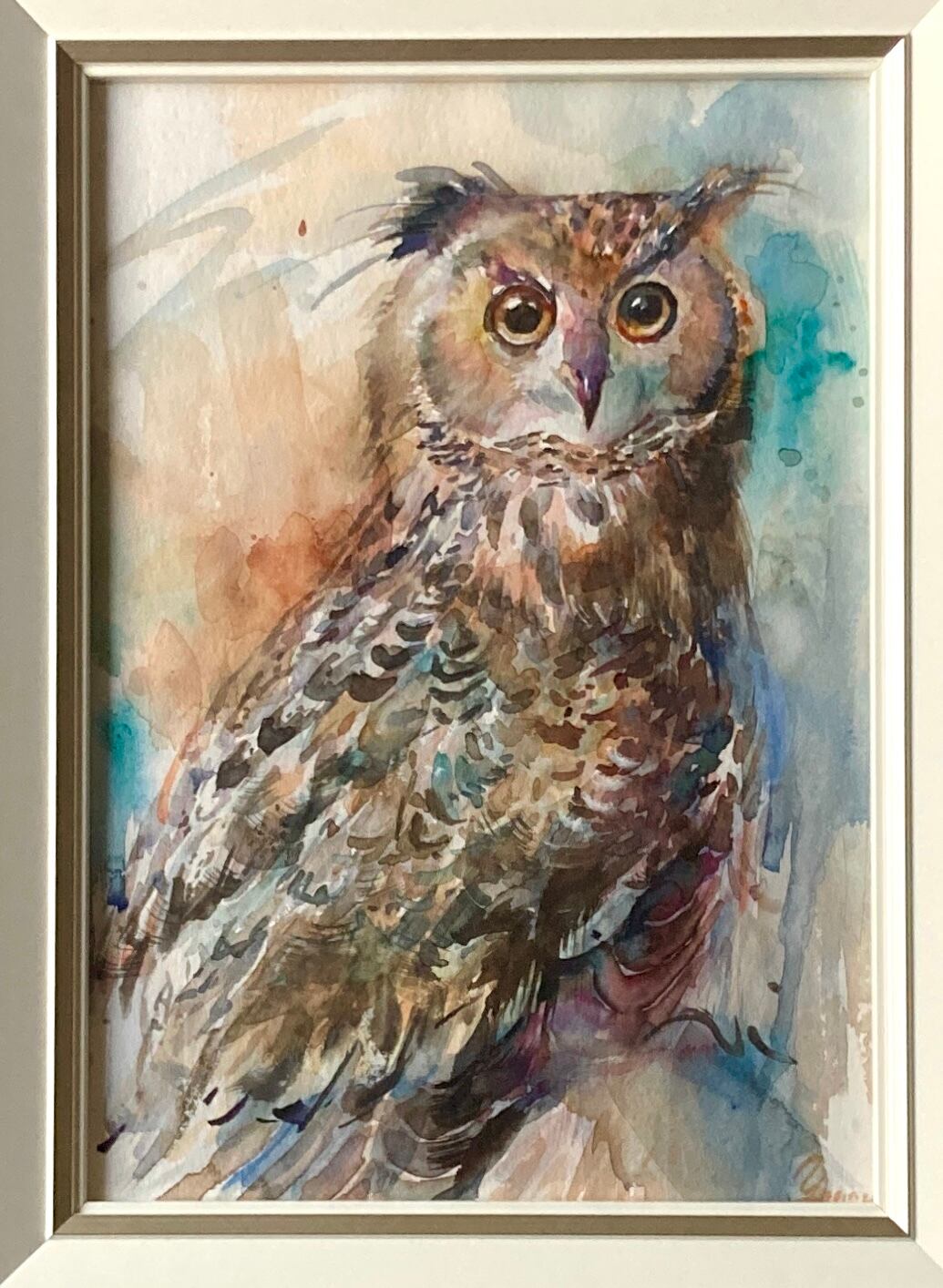 自然な色合いで描かれたフクロウの水彩画、リアルな描写が魅力。