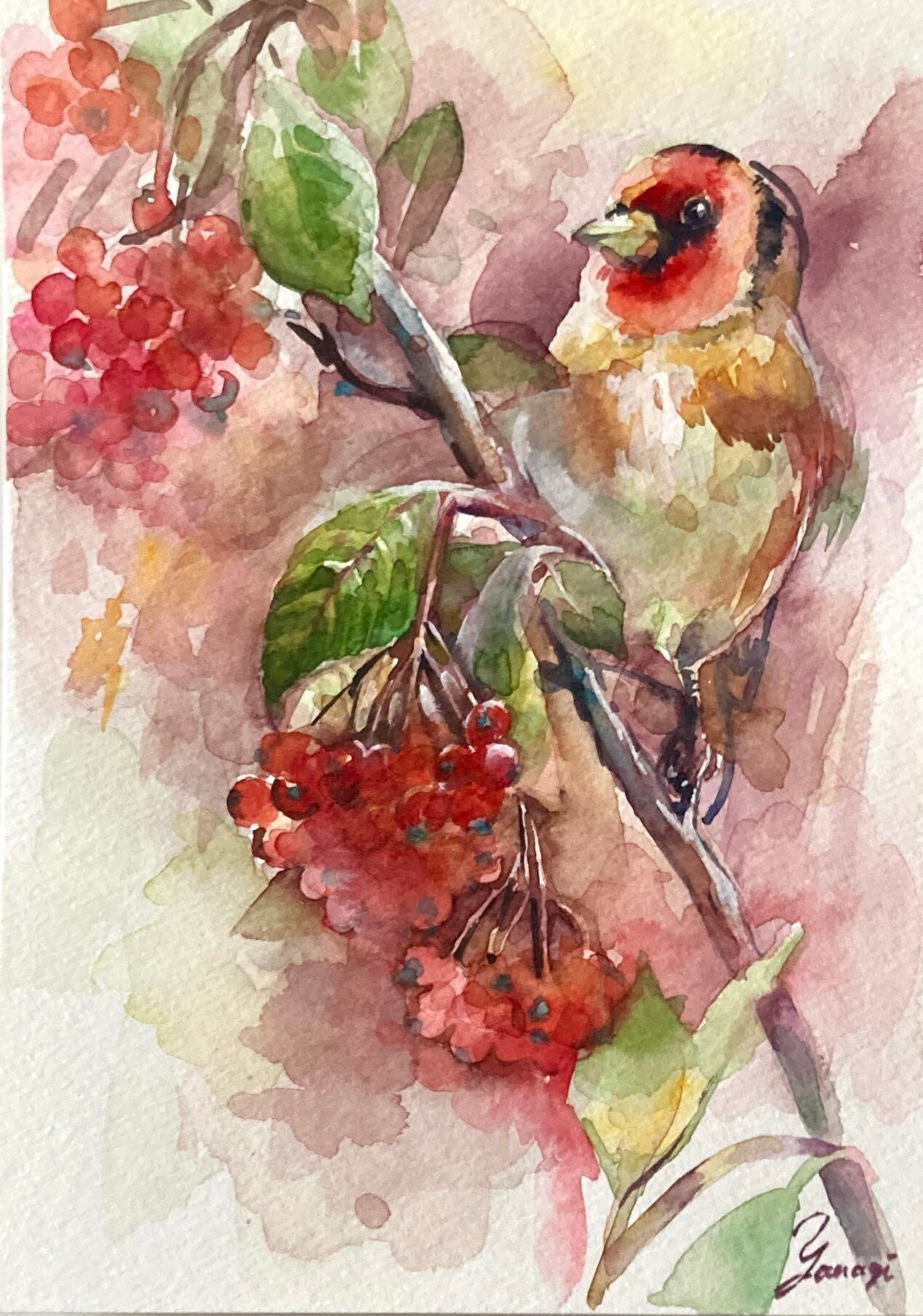 #ゴシキヒワ#鳥#小鳥#果実#果物#透明水彩 #水彩 #水彩画 #イラスト #アート #art #アナログ #インテリア #飾り #鑑賞 #美術 #芸術 #作品 #ギャラリー #watercolor