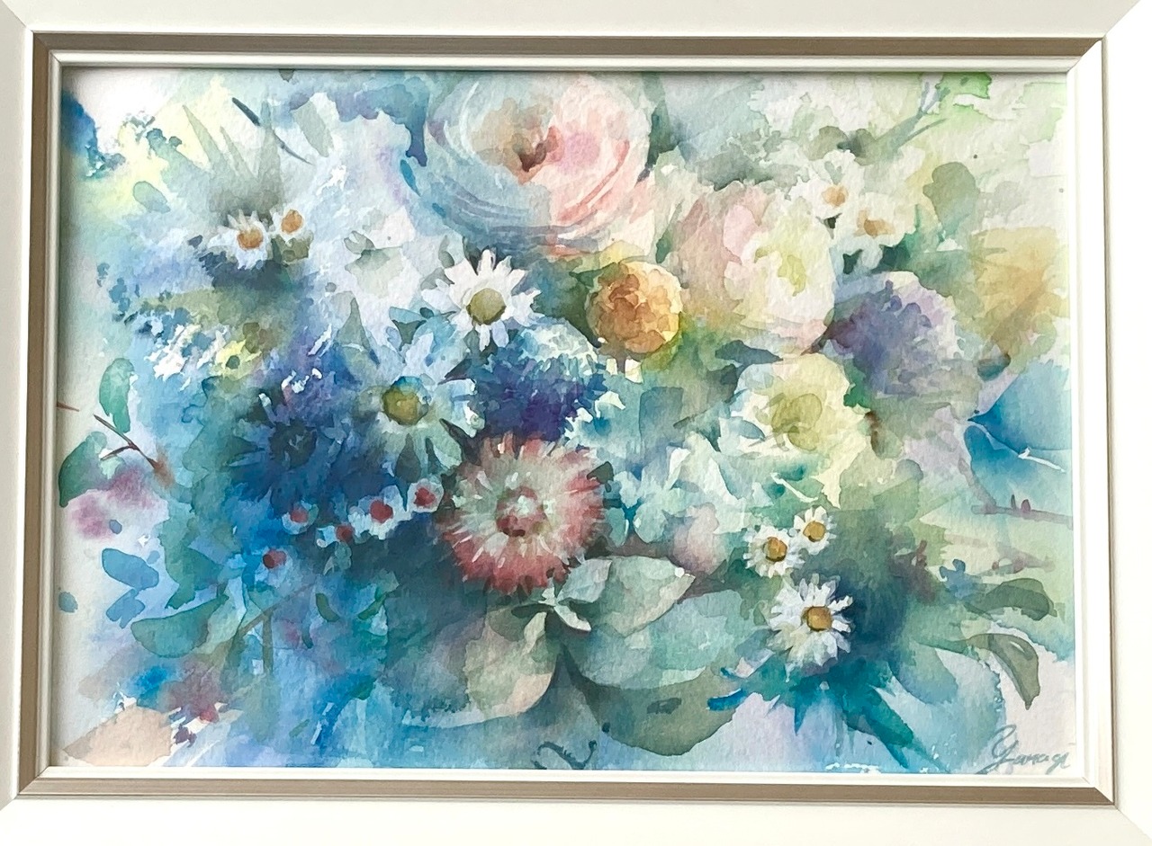 青と緑の色合いが美しい花束の水彩画、サイン入り。
