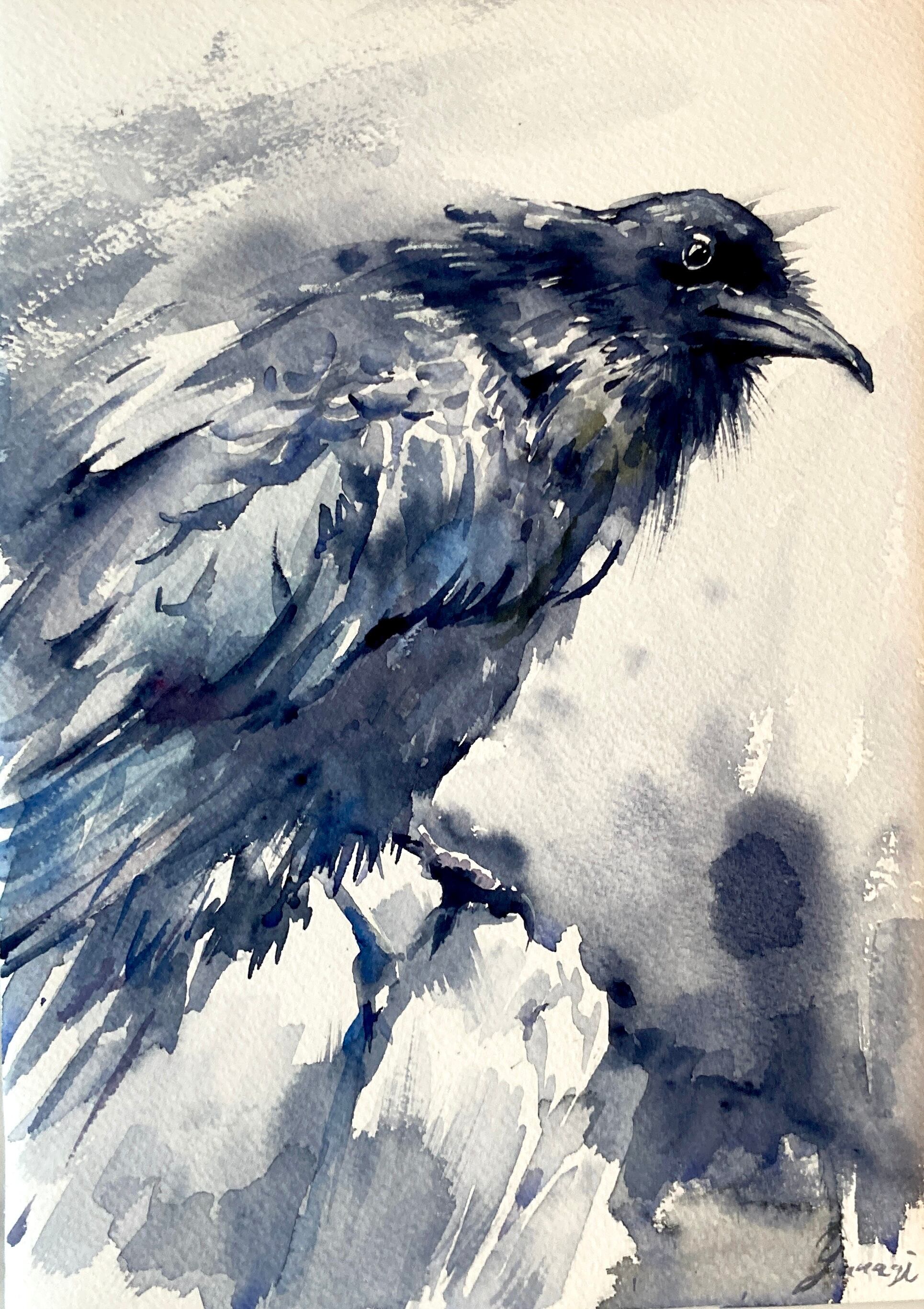 青と黒のグラデーションで描かれたカラスの水彩画。