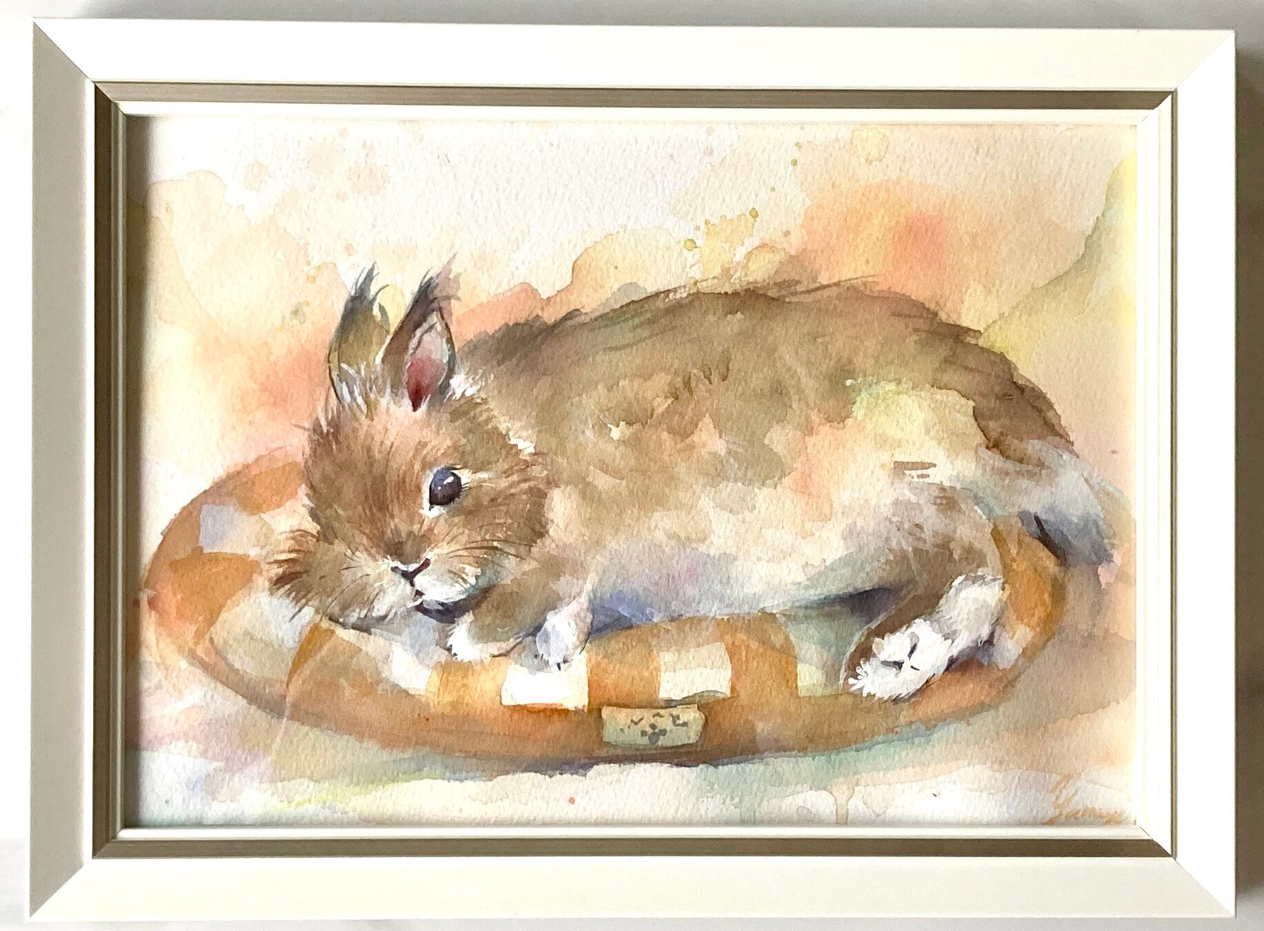 ウサギが寝そべる水彩画、柔らかい色合いが特徴。