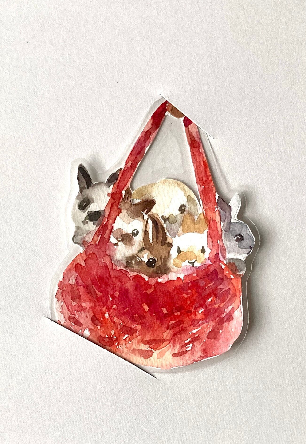 赤いニットバッグの中に6羽のうさぎちゃんをつめました。