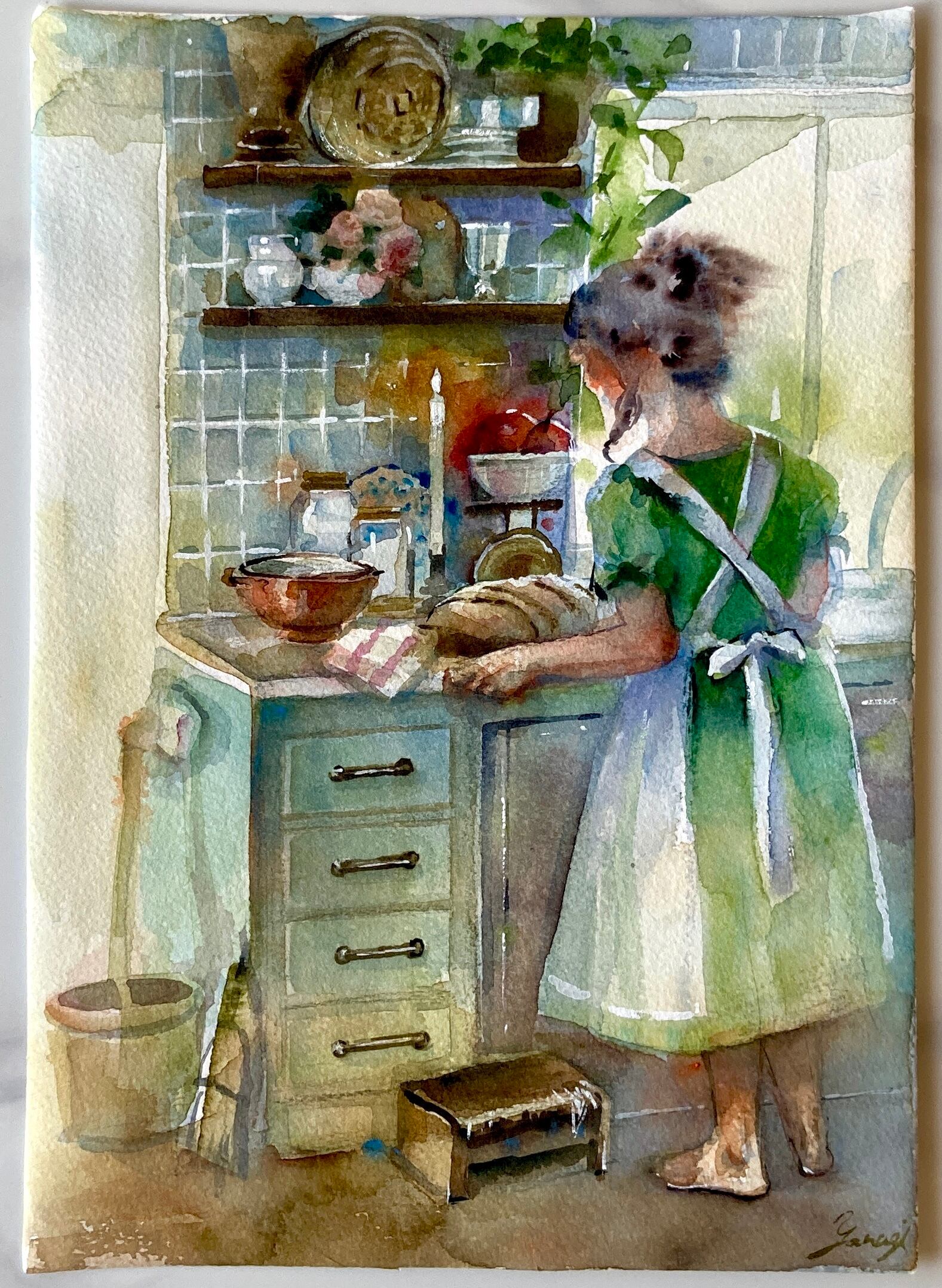 台所でパンを扱う少女の水彩画、緑と白のエプロンが特徴。