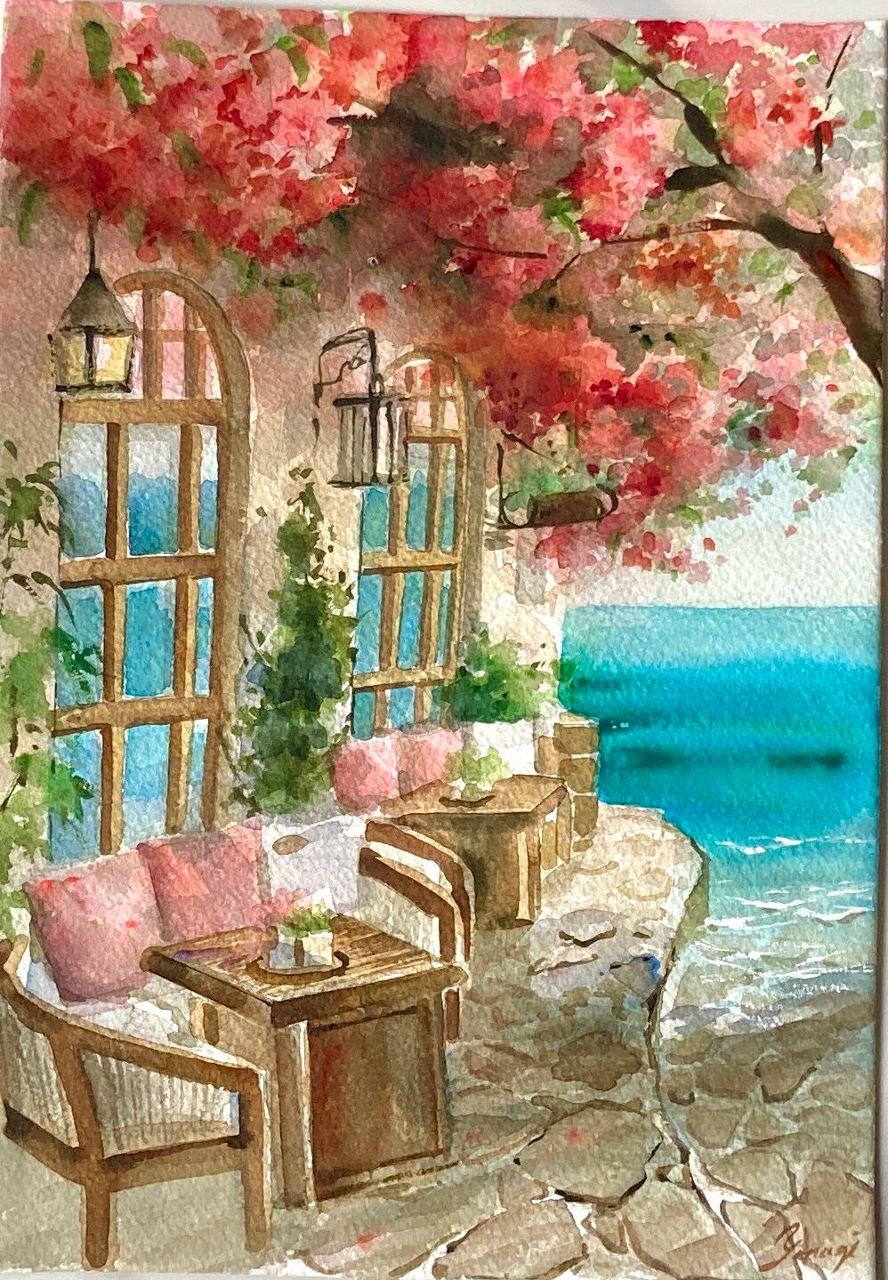 海辺のカフェを描いた美しい水彩画、ピンクの花が印象的。