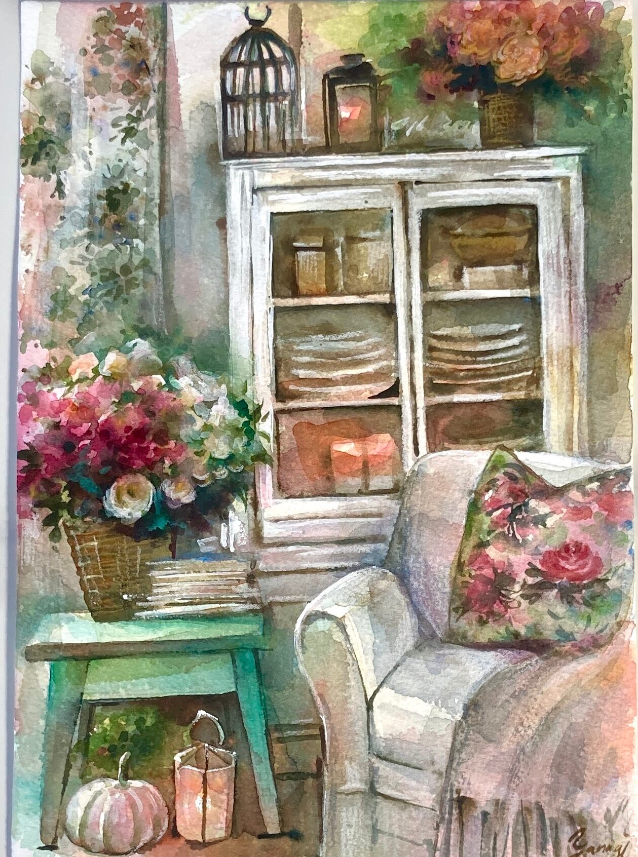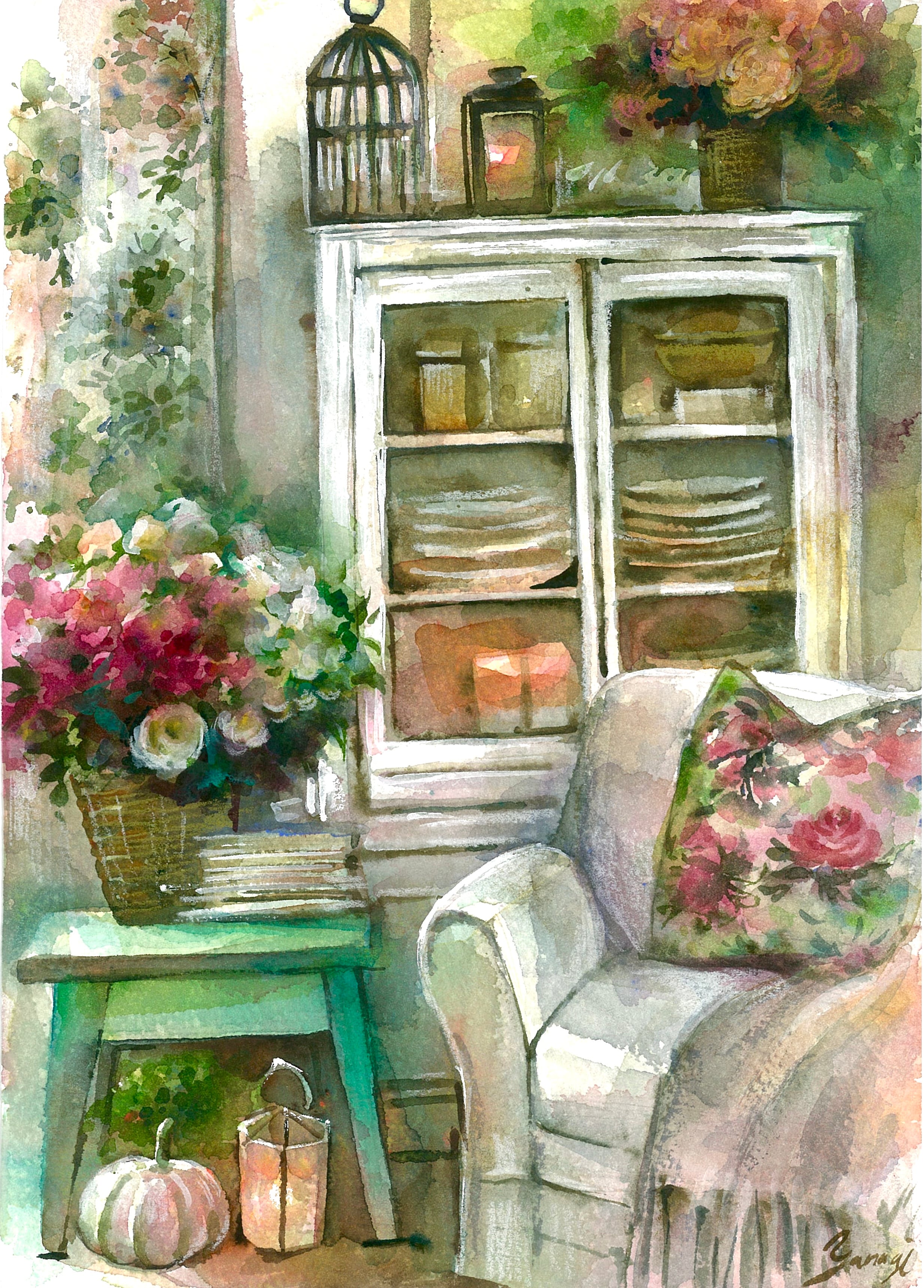 #ランタン#室内画#椅子#クッション#観葉植物#風景画#花#葉っぱ#植物#風景#透明水彩 #水彩 #水彩画 #イラスト #アート #art #アナログ #インテリア #飾り #鑑賞 #美術 #芸術 #作品 #ギャラリー #watercolor