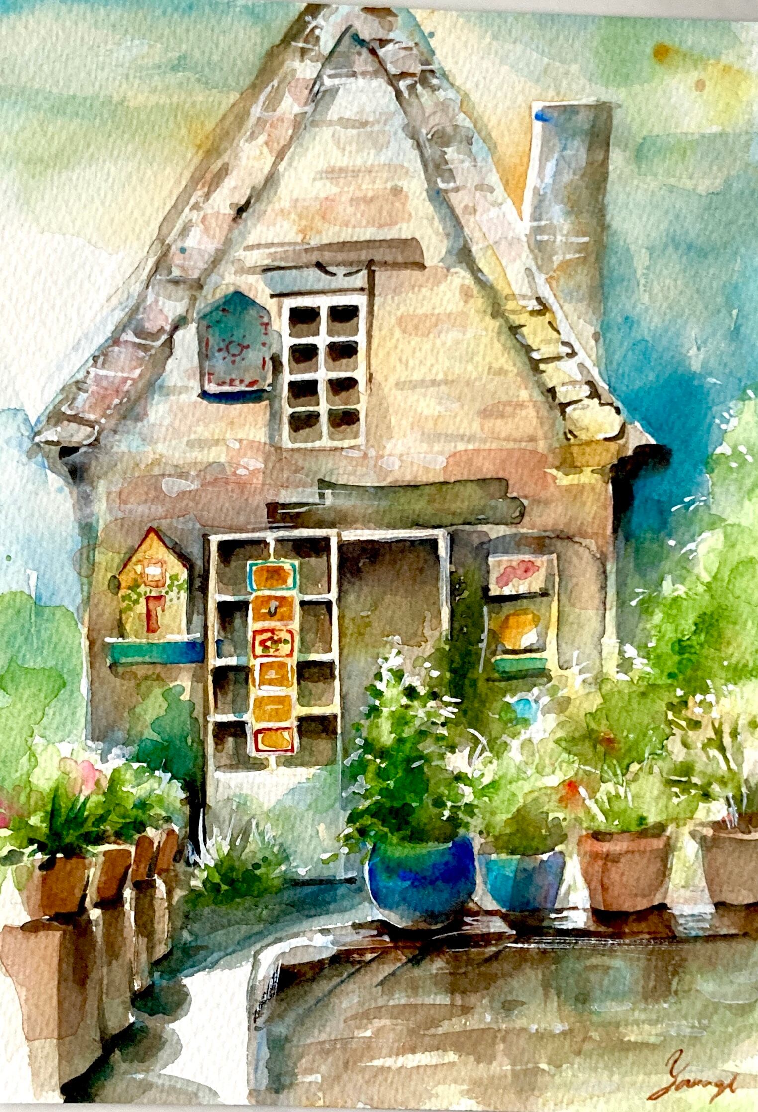 明るい色合いの水彩画、家と植物が描かれた作品。