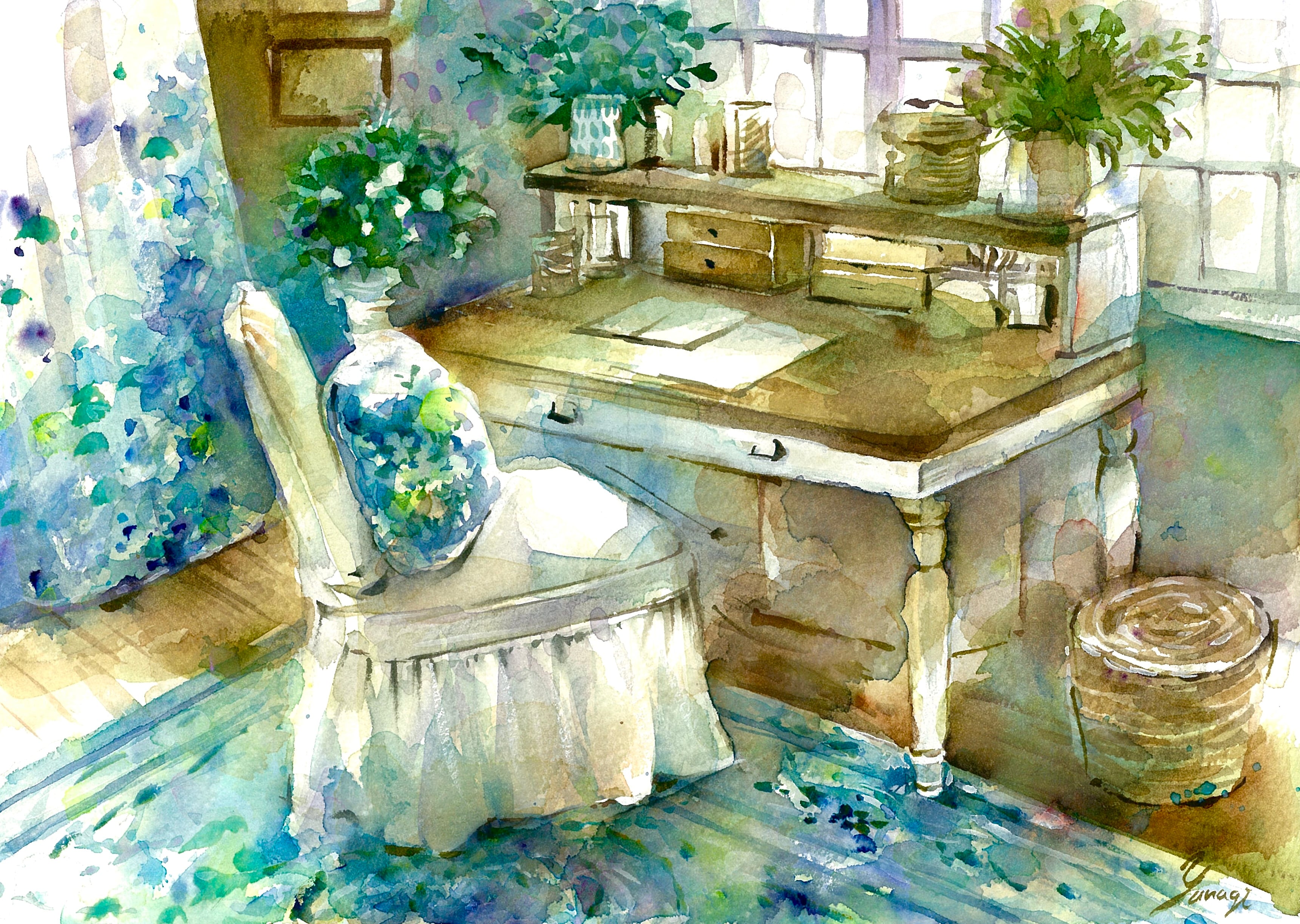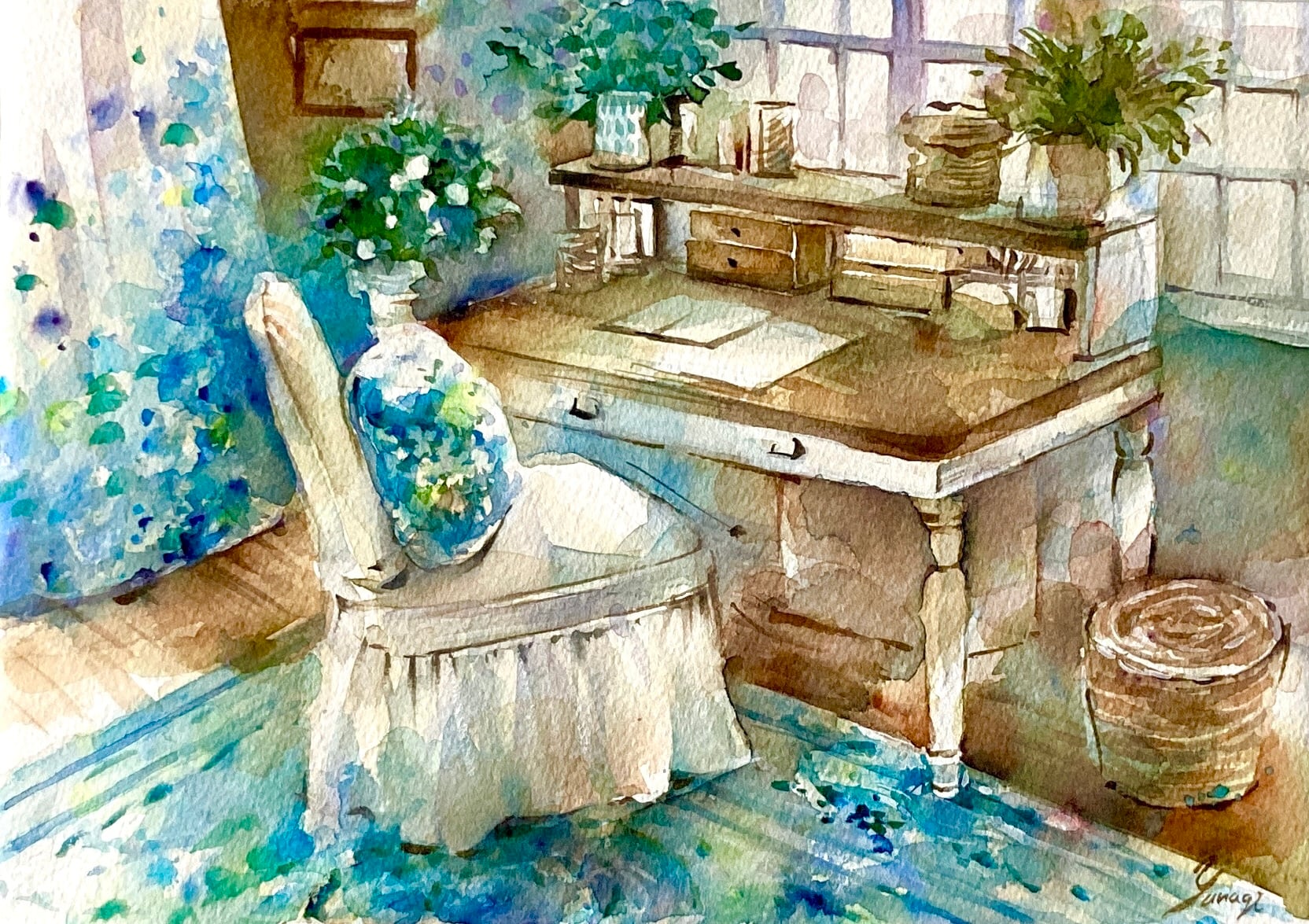 #室内画#花柄#デスク#フリル#椅子#観葉植物#風景画#花#葉っぱ#植物#風景#透明水彩 #水彩 #水彩画 #イラスト #アート #art #アナログ #インテリア #飾り #鑑賞 #美術 #芸術 #作品 #ギャラリー #watercolor