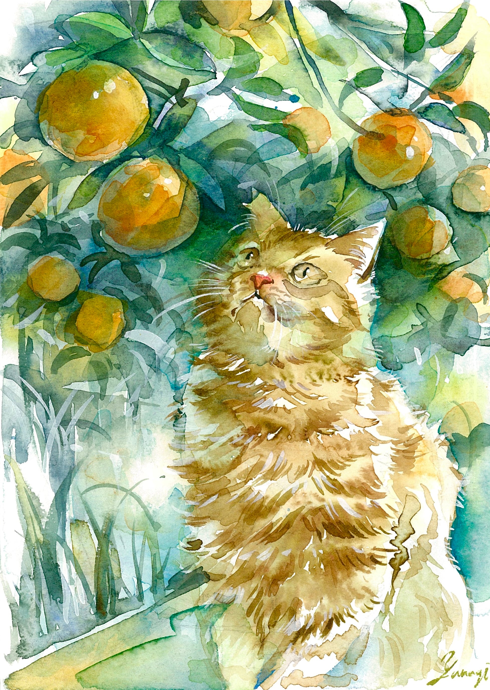 #猫#ねこ#野良猫#木#オレンジ#みかん#透明水彩 #水彩 #水彩画 #イラスト #アート #art #アナログ #インテリア #飾り #鑑賞 #美術 #芸術 #作品 #ギャラリー #watercolor