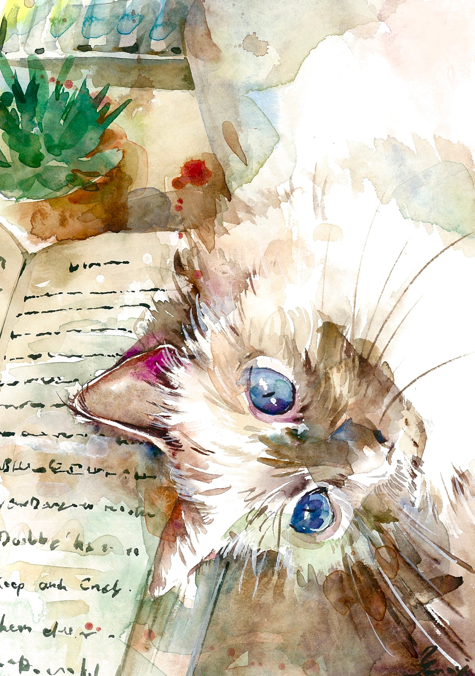 柔らかい色合いの水彩画で描かれた猫の作品。