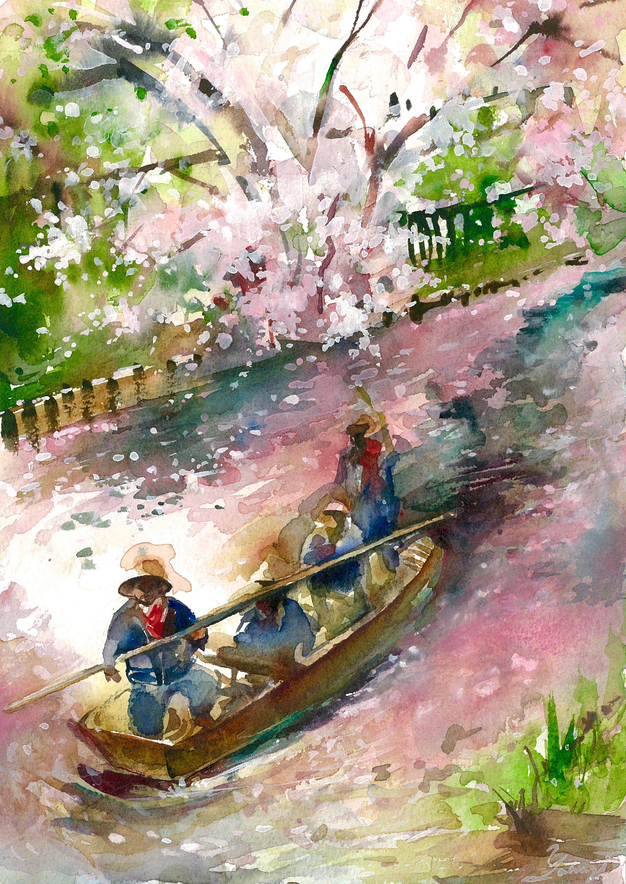 桜の下で舟を漕ぐ風景を描いた水彩画。
