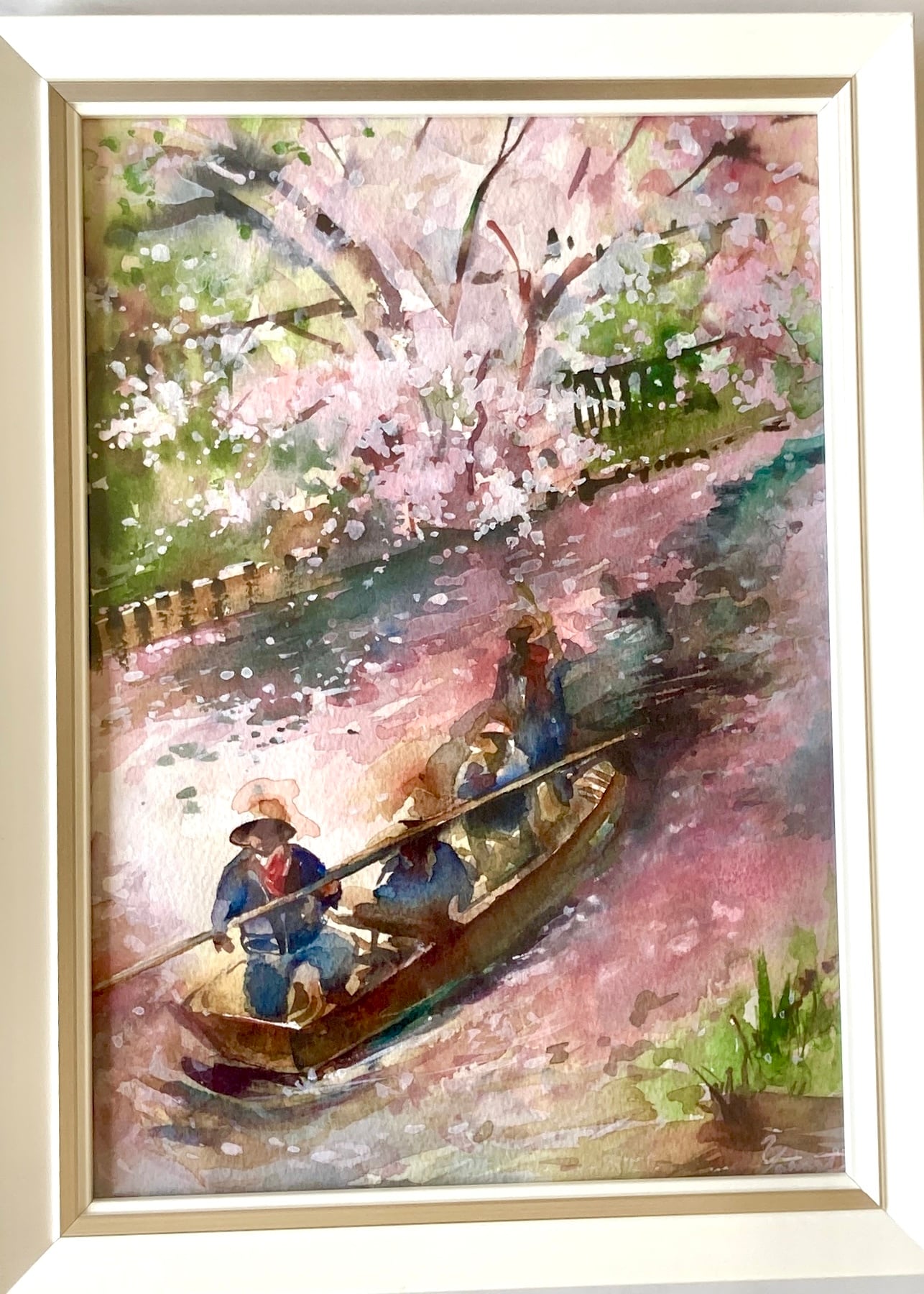 #桜#さくら#舟#川#春#花#葉っぱ#植物#風景#透明水彩 #水彩 #水彩画 #イラスト #アート #art #アナログ #インテリア #飾り #鑑賞 #美術 #芸術 #作品 #ギャラリー #watercolor
