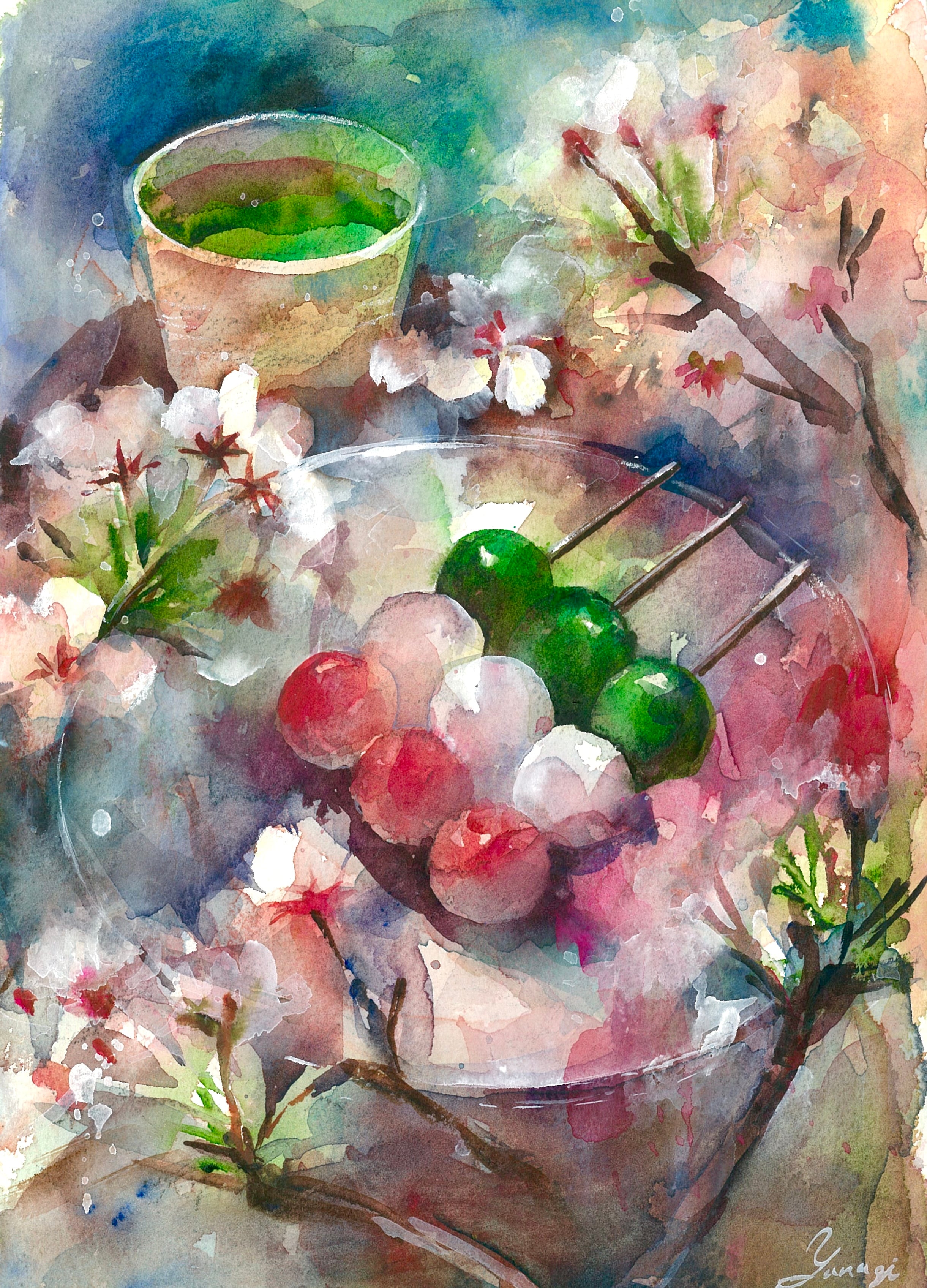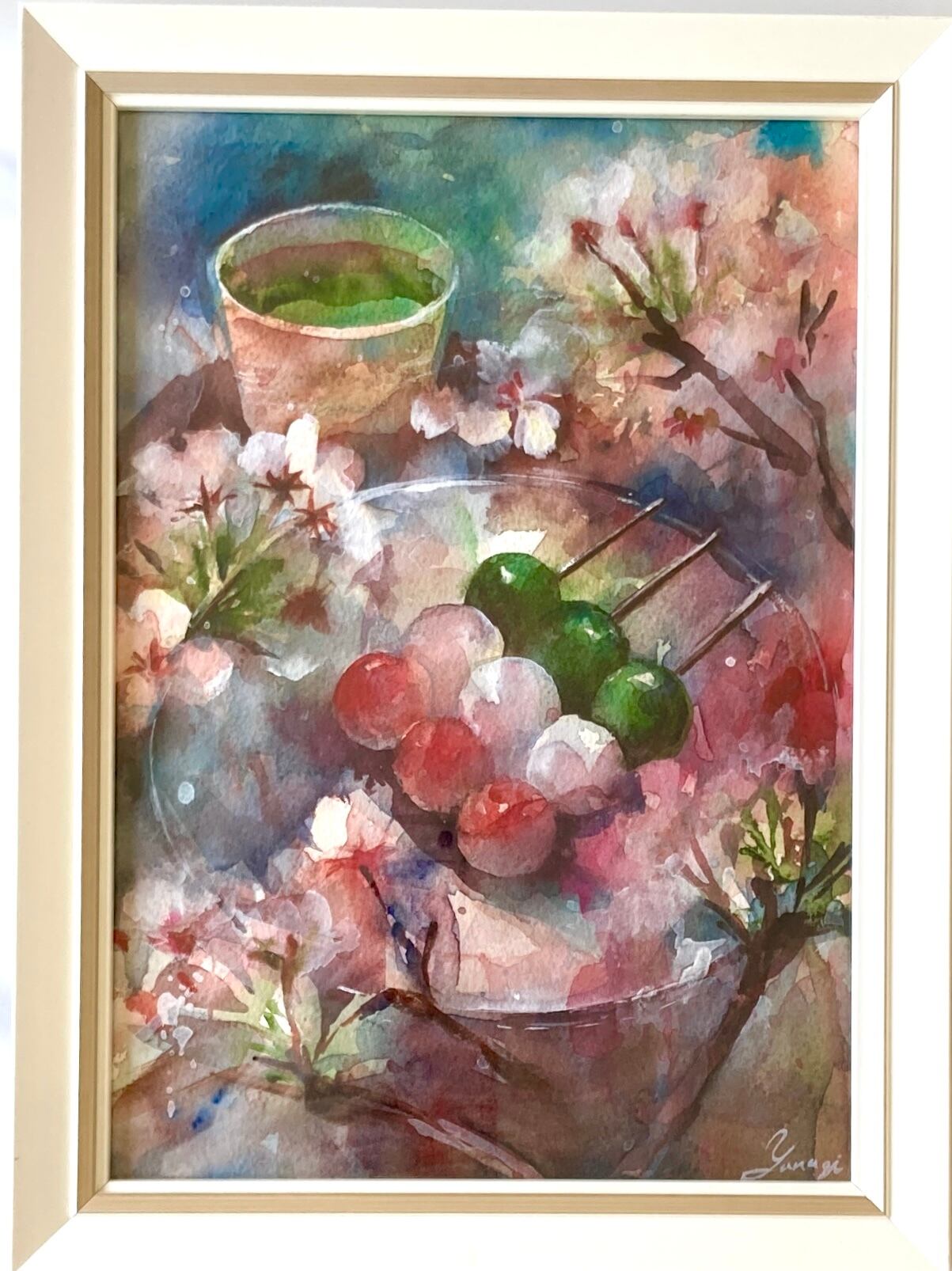 #静物#春#桜#さくら#三色団子#団子#和菓子#緑茶#花#葉っぱ#植物#風景#透明水彩 #水彩 #水彩画 #イラスト #アート #art #アナログ #インテリア #飾り #鑑賞 #美術 #芸術 #作品 #ギャラリー #watercolor