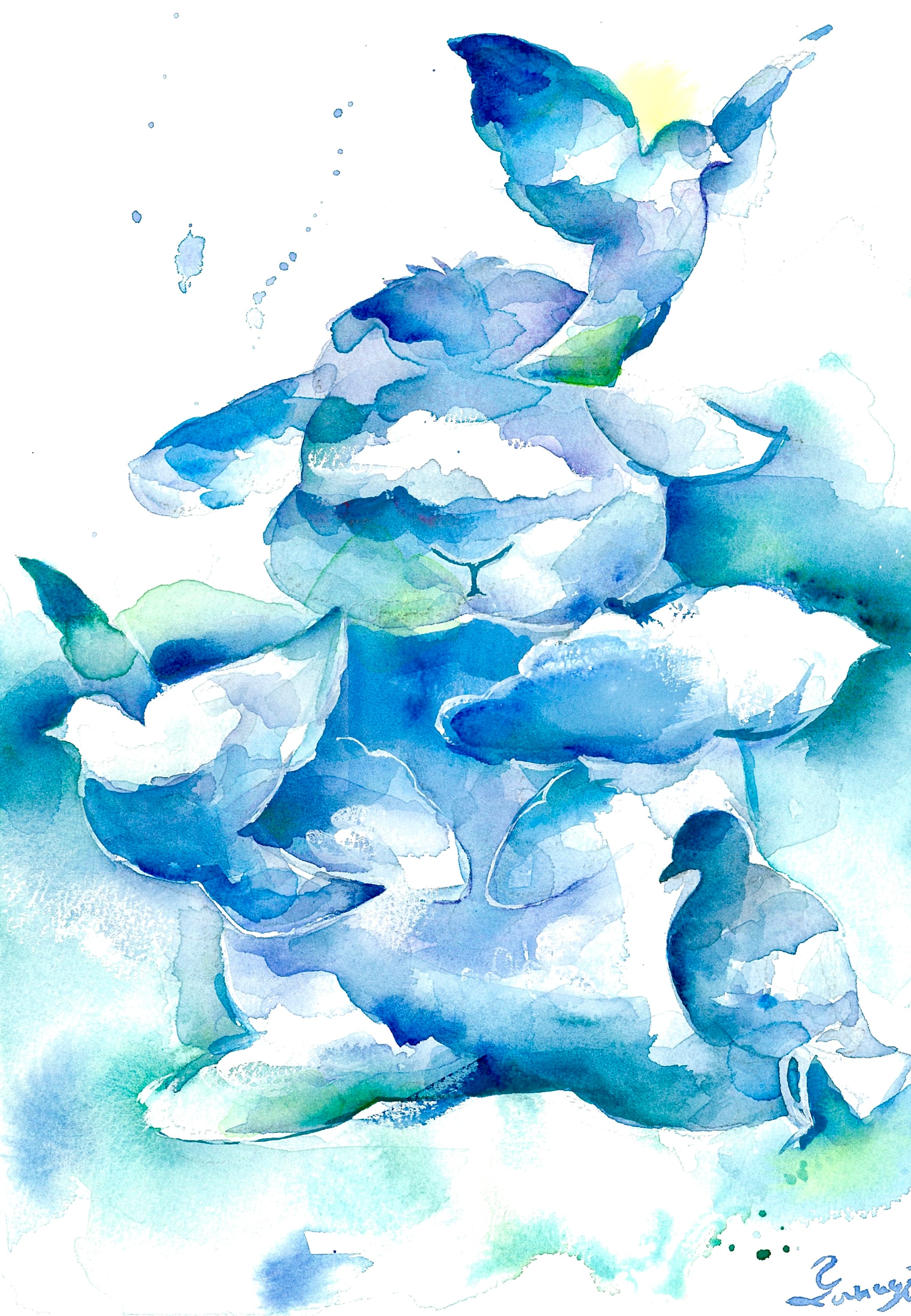 青色の水彩画で、鳥の形を描いた作品です。