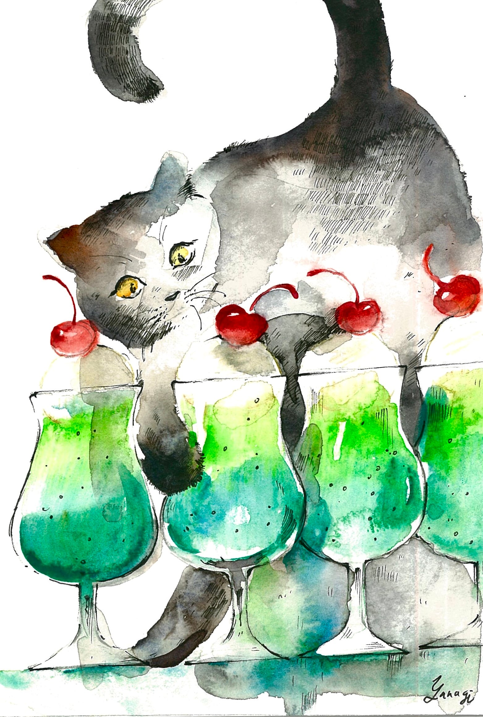 猫がクリームソーダに遊ぶ水彩画で、色鮮やかな緑と黒のコントラストが特徴。