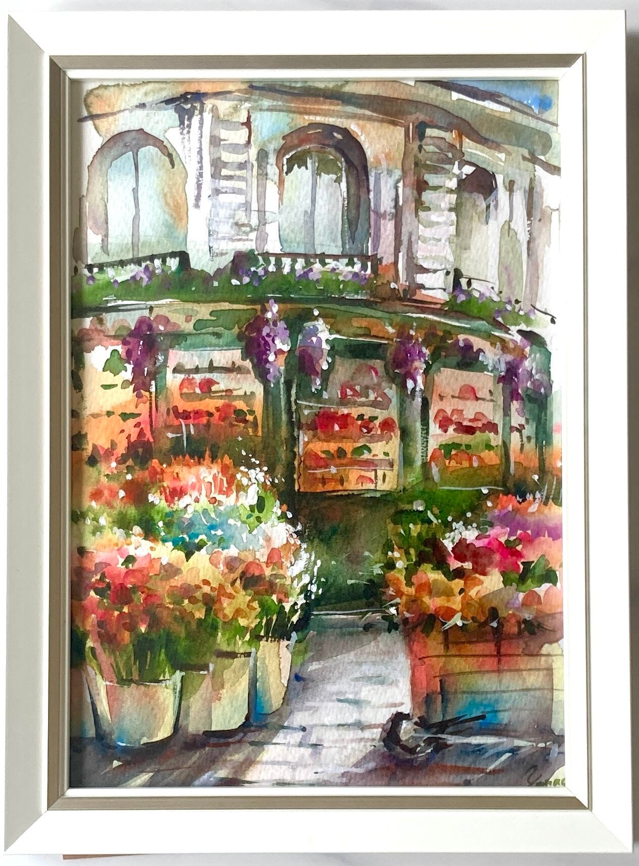 水彩画 原画 街角の花屋