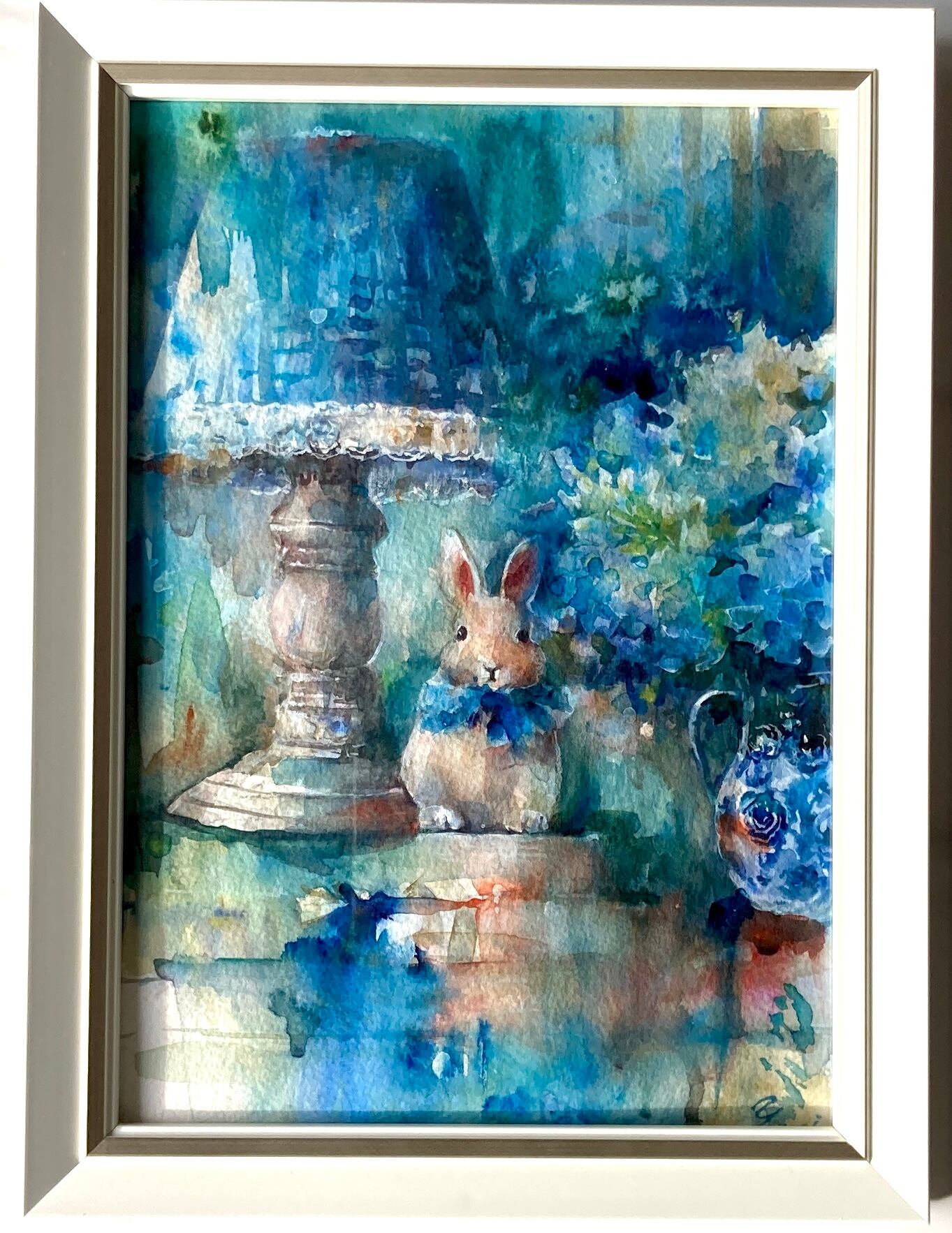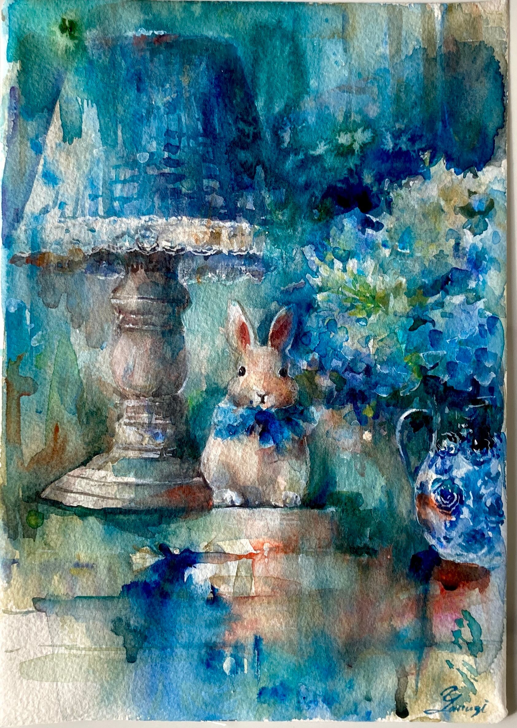 #室内画#ランプ#うさぎ#リボン#チェック#紫陽花#あじさい#花#葉っぱ#植物#風景#透明水彩 #水彩 #水彩画 #イラスト #アート #art #アナログ #インテリア #飾り #鑑賞 #美術 #芸術 #作品 #ギャラリー #watercolor