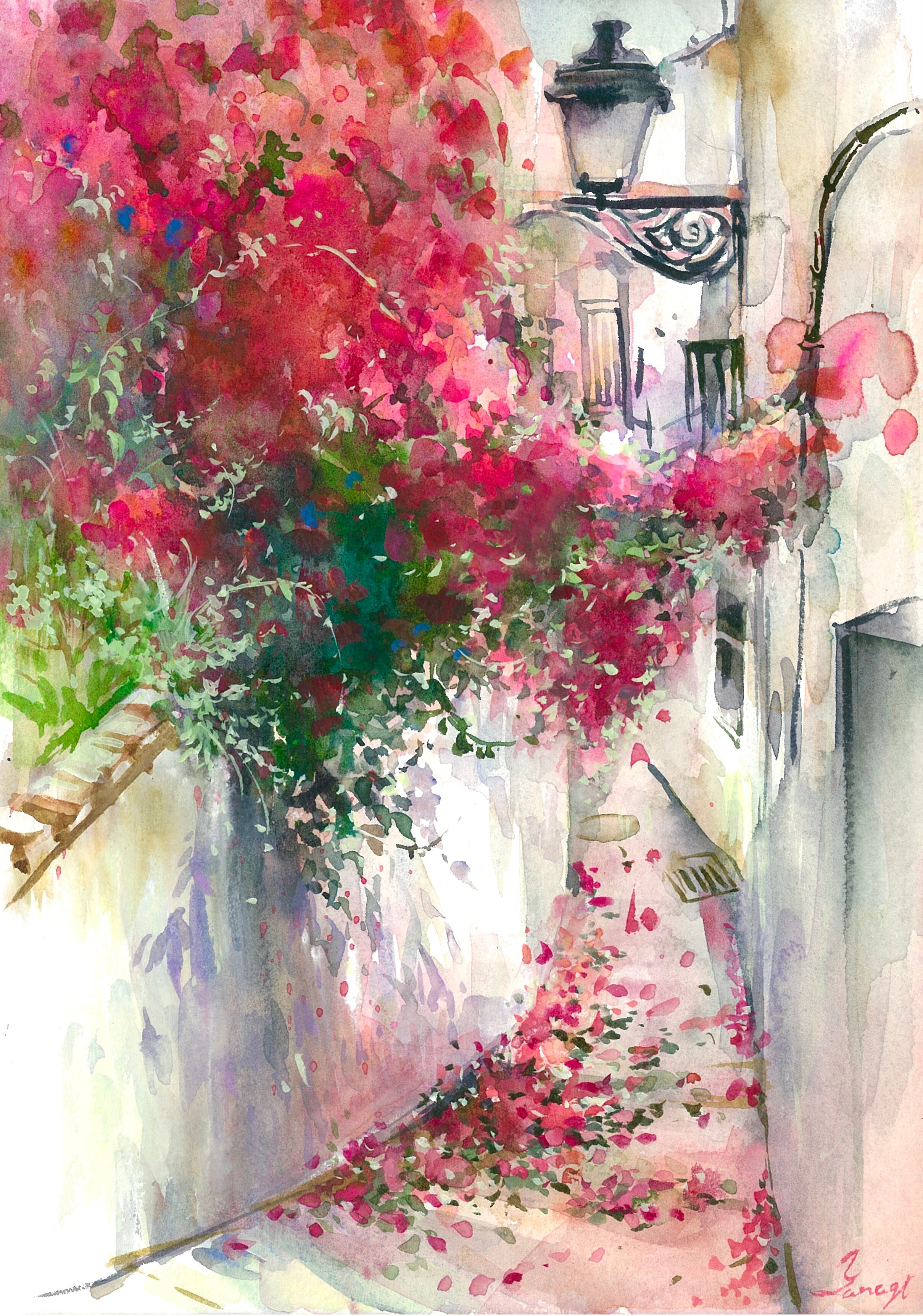 赤い花が印象的な水彩画で、街並みの情景を描写。