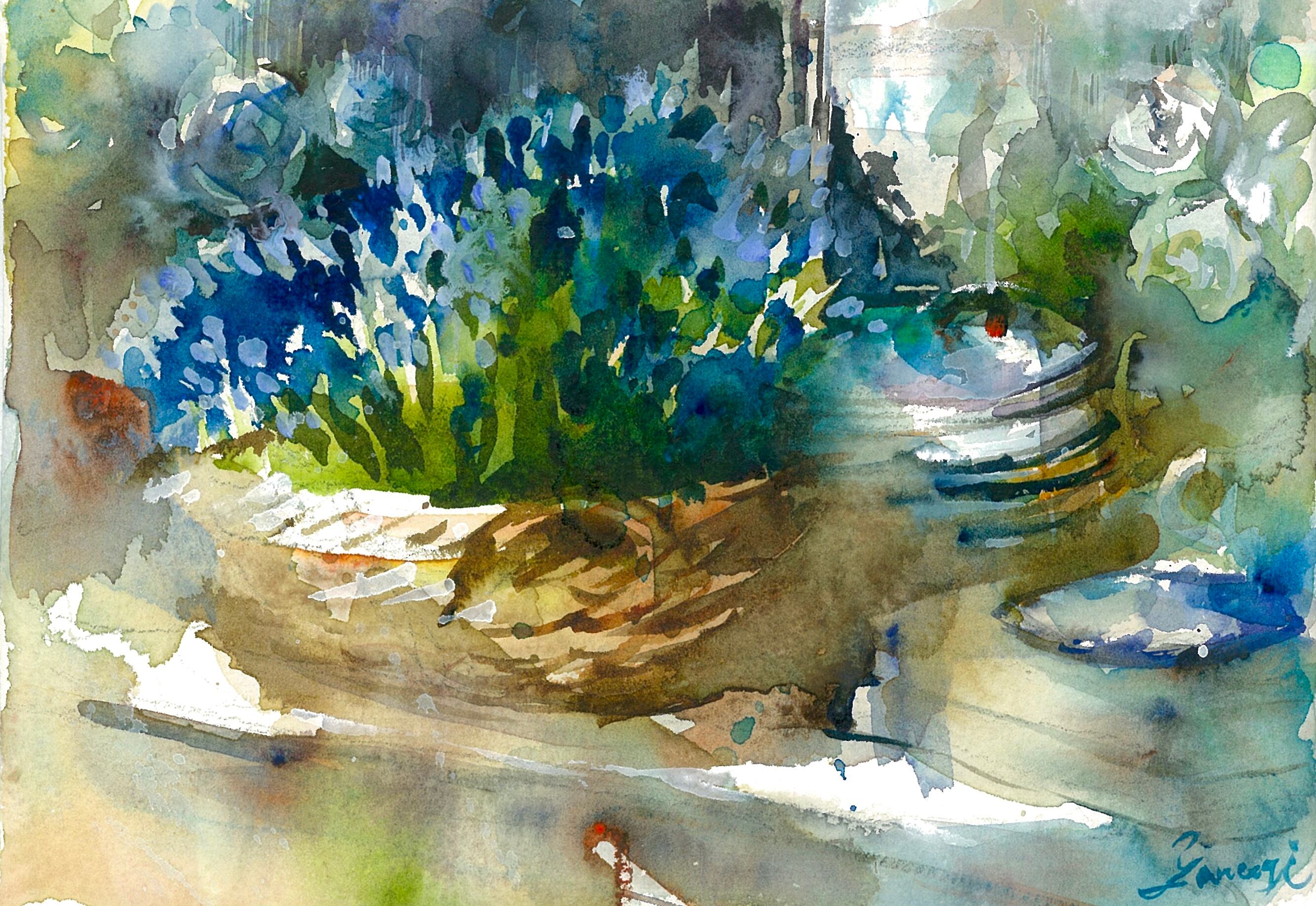 青と緑の花が印象的な水彩画。