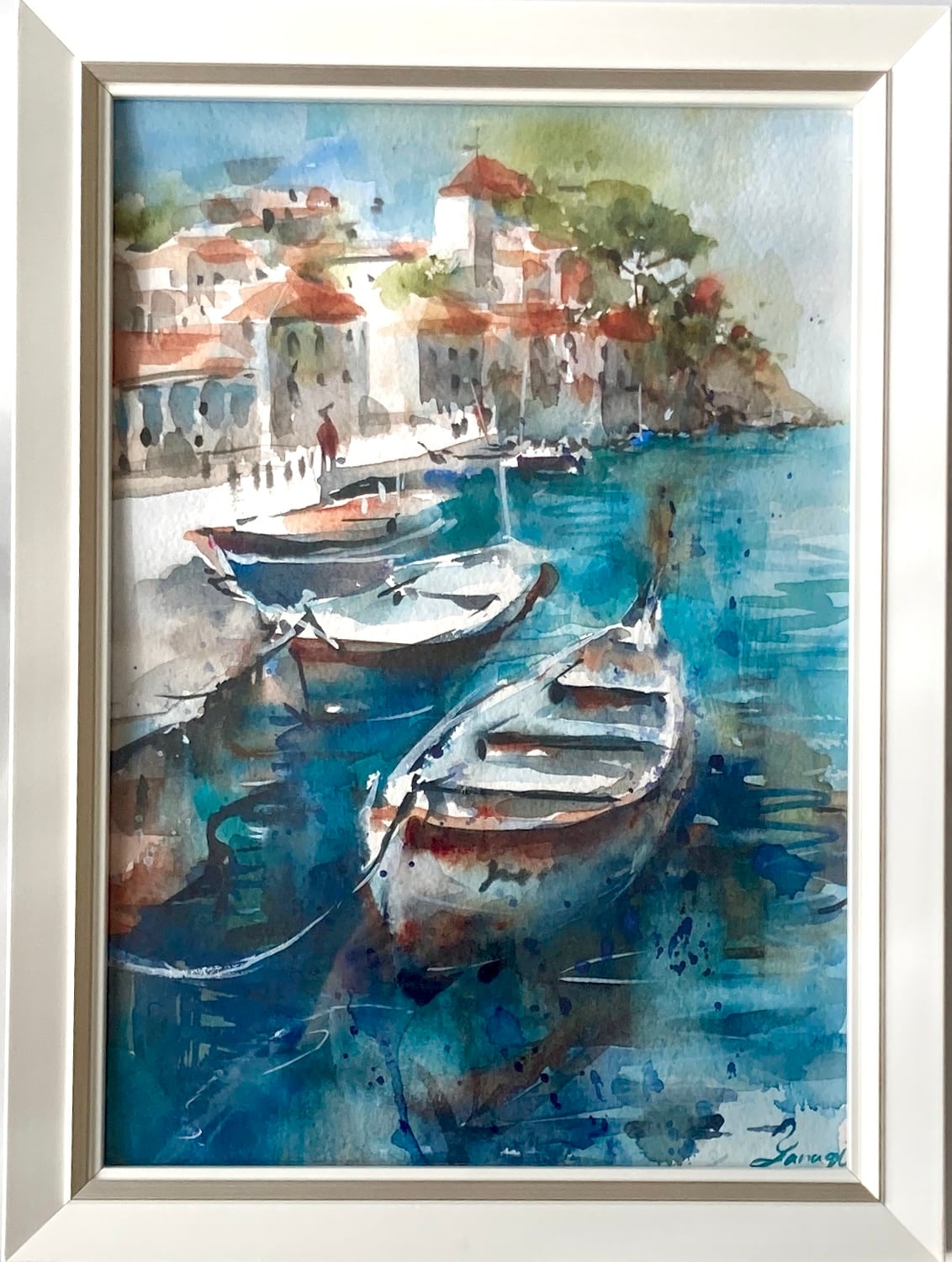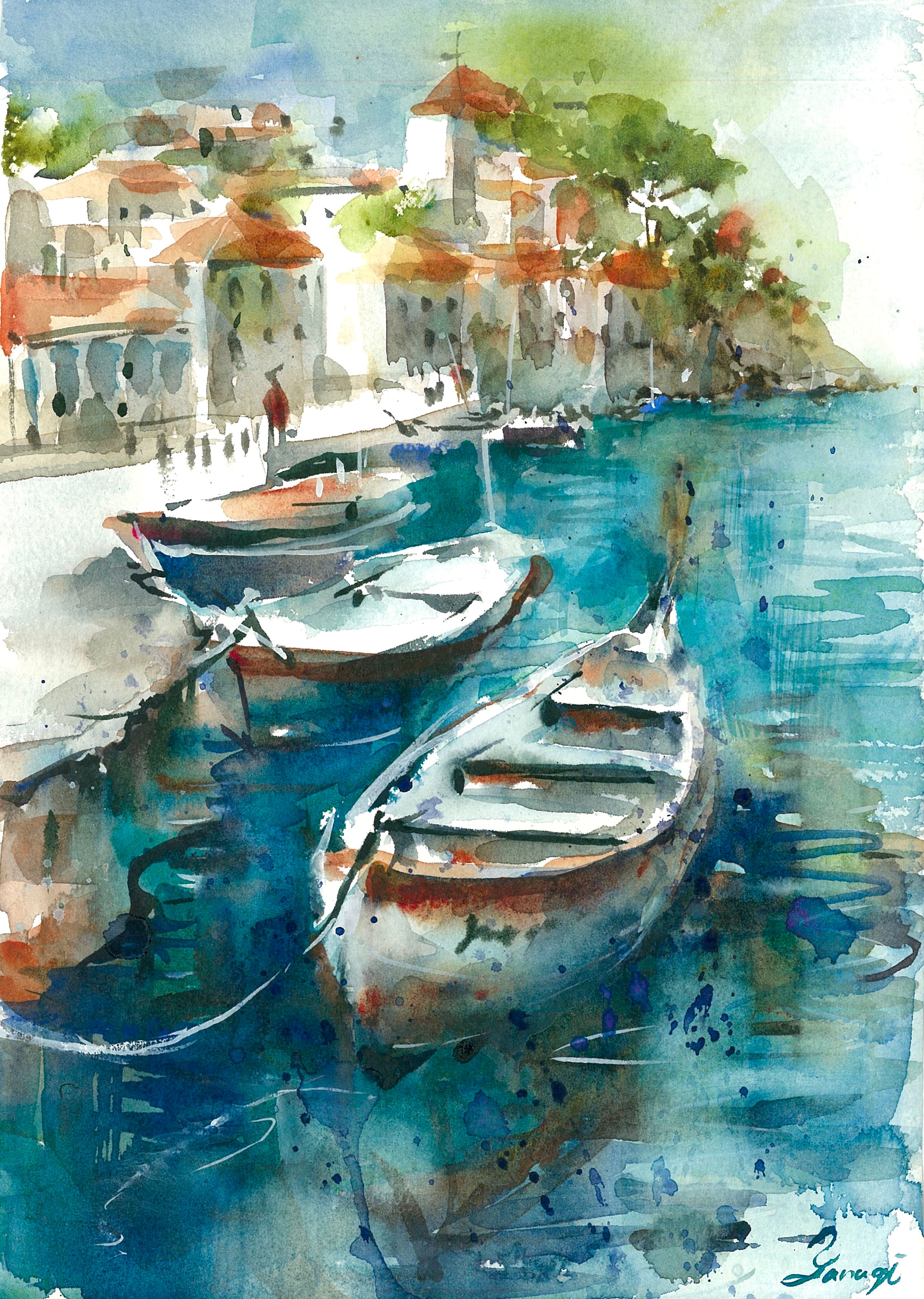 #風景画#船#舟#漁港#海#建物#透明水彩 #水彩 #水彩画 #イラスト #アート #art #アナログ #インテリア #飾り #鑑賞 #美術 #芸術 #作品 #ギャラリー #watercolor